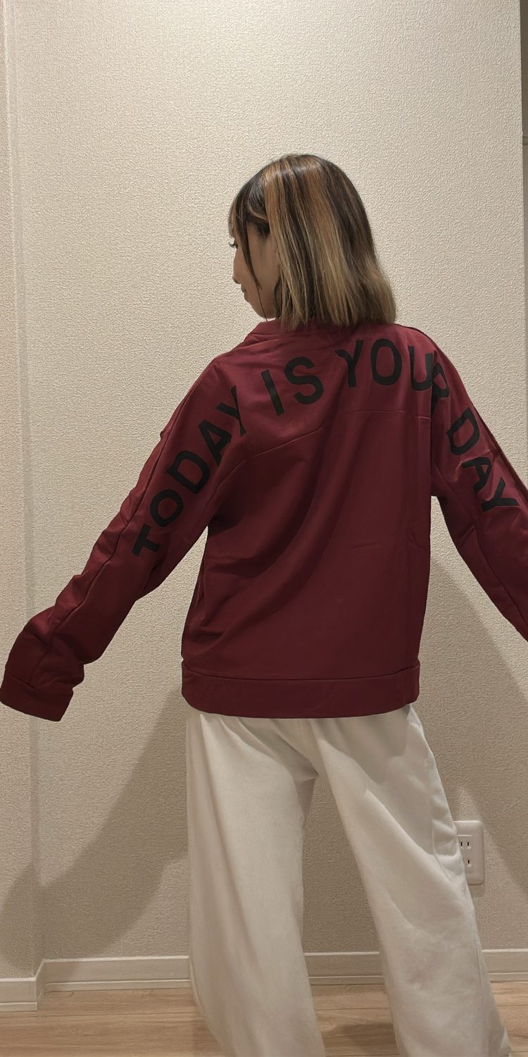 ストレッチ起毛スウェット生地で、柔らかく ほどよ〜く起毛がありますので、着心地が良く、ルームウェアにしたいくらいです😊 フロントには 胸の中央あたりに 小さくFREDDYのロゴを刺繍。背中の上部に「TODAY IS YOUR DAY」 のメッセージ✨✨✨ シンプルなデザインだけど存在感があります😊 私の身長148cm 着用サイズは S です。 参考までに😊 ボルドー、...