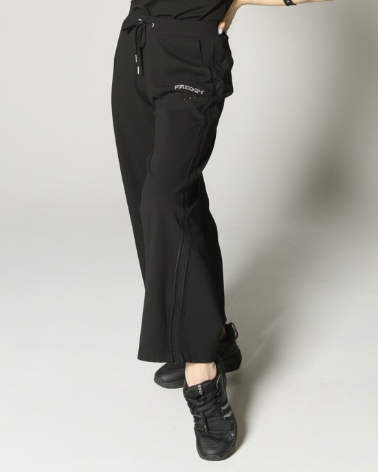 左胸にあしらわれた薄ピンクのビーズによるFREDDYロゴと、サイドに配された光沢のあるエラスティック・インサートが、スポーティなアイテムにエレガントなエッセンスを添えています。