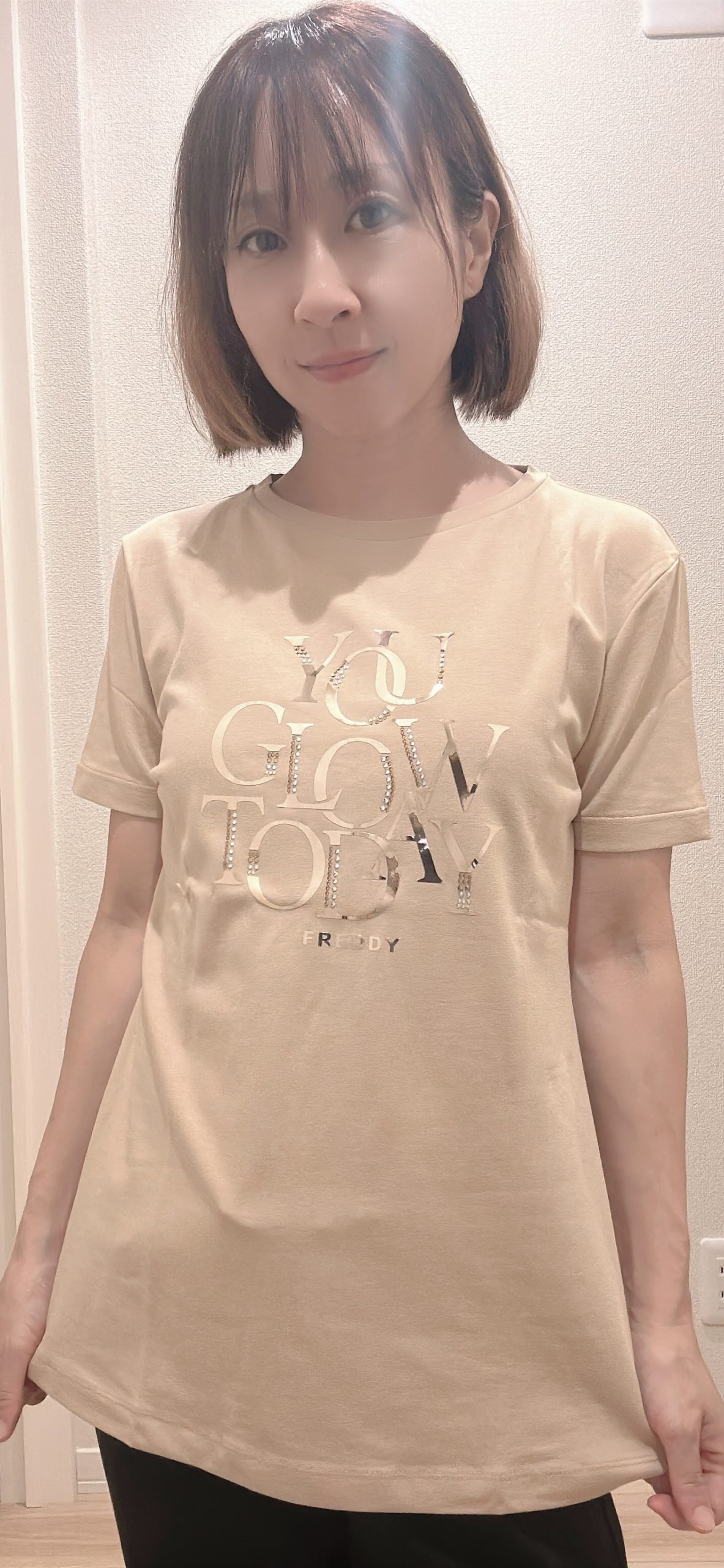 October 6, 2025 エレガント〜✨✨✨ とても 着ててあがる⤴️ Tシャツ✨✨✨✨ フロントに「YOU GLOW TODAY」ゴールドのラインストーンで華やかに輝いてます🤩🤩🤩 着心地もよく最高ー💖ですっ 着用サイズは S です。 参考までに。 ご注文の際は クーポンコード欄 FR400 適用 🔘を押してください! 半袖Tシャツ
