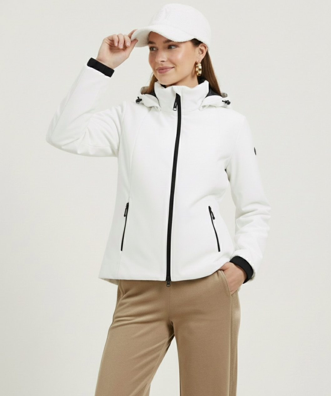 袖には控えめなラインストーンロゴをあしらい、スポーティな中にさりげなくフェミニンなニュアンスを加えています。