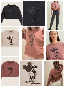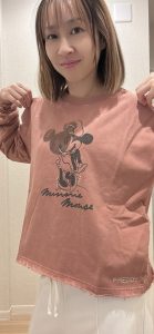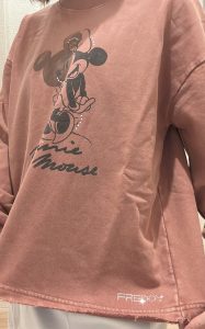 フロントにはミニーマウスとミッキーマウスのグラフィックを大胆に配し、ラインストーンの繊細な輝きがさりげないアクセントになっています。